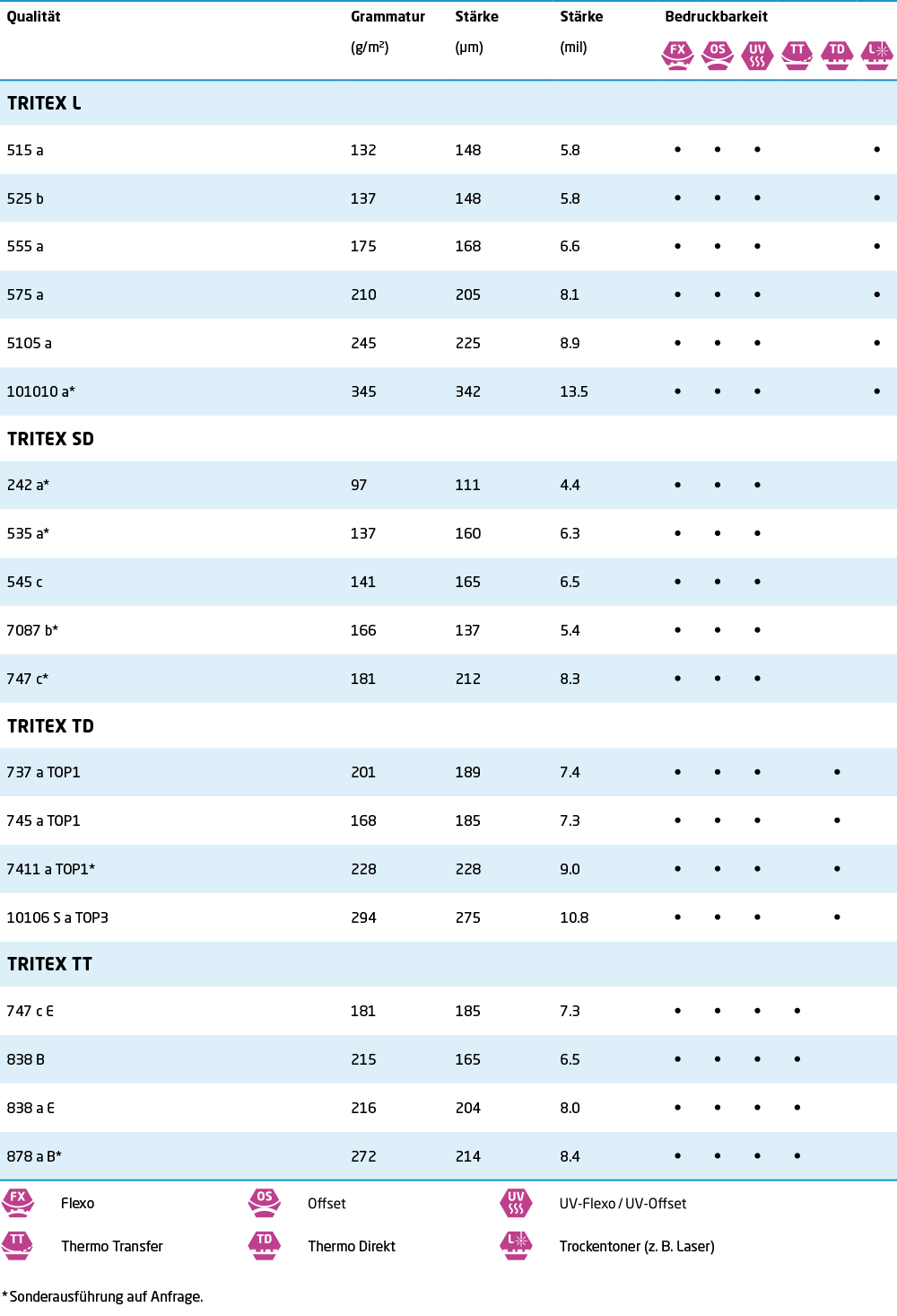 Sehen Sie die technischen Daten und jeweiligen Druckverfahren unserer Standardqualitäten auf einen Blick.